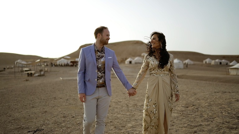 Neda and John took us to one of the new hot wedding destinations, Morocco, where we mixed into a new culture with a new wedding adventure. Marrakech is a vibrant city, full of sounds, colors and amazing and historic architecture. We spent three wonderful days with the couple and their family, especially the experience in the Desert d’Agafay in the beautiful ‘Scarabeo Camp’, a luxury camping with white curtains, moroccan rugs, a fascinating experience of the couple crossing the desert with camels and try Moroccan meals immersed in the Berber atmosphere.